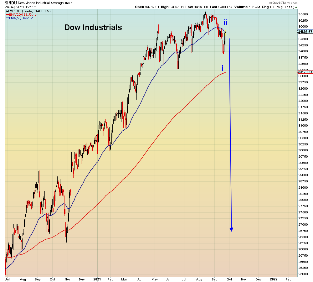 Here we see this is by far the Dow's longest stretch below the 50 dma in 2021. If this wave count is correct then the next stop is the 200 dma (red line) which is -10% from the top. If that line is breached then the wheels come off the bus.